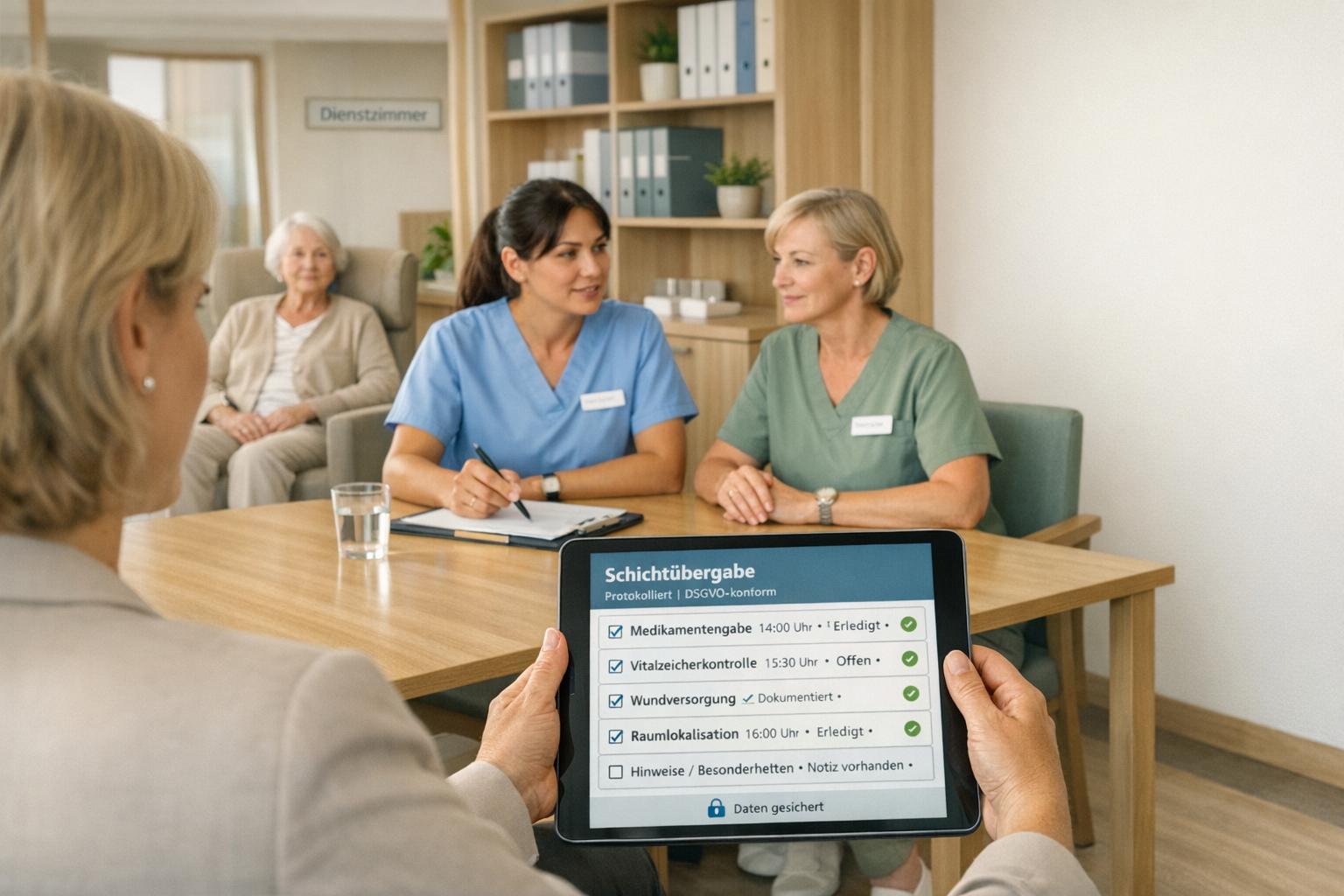 Digitale Schichtübergaben sparen Zeit, reduzieren Fehler und bieten revisionssichere, DSGVO-konforme Pflegedokumentation.