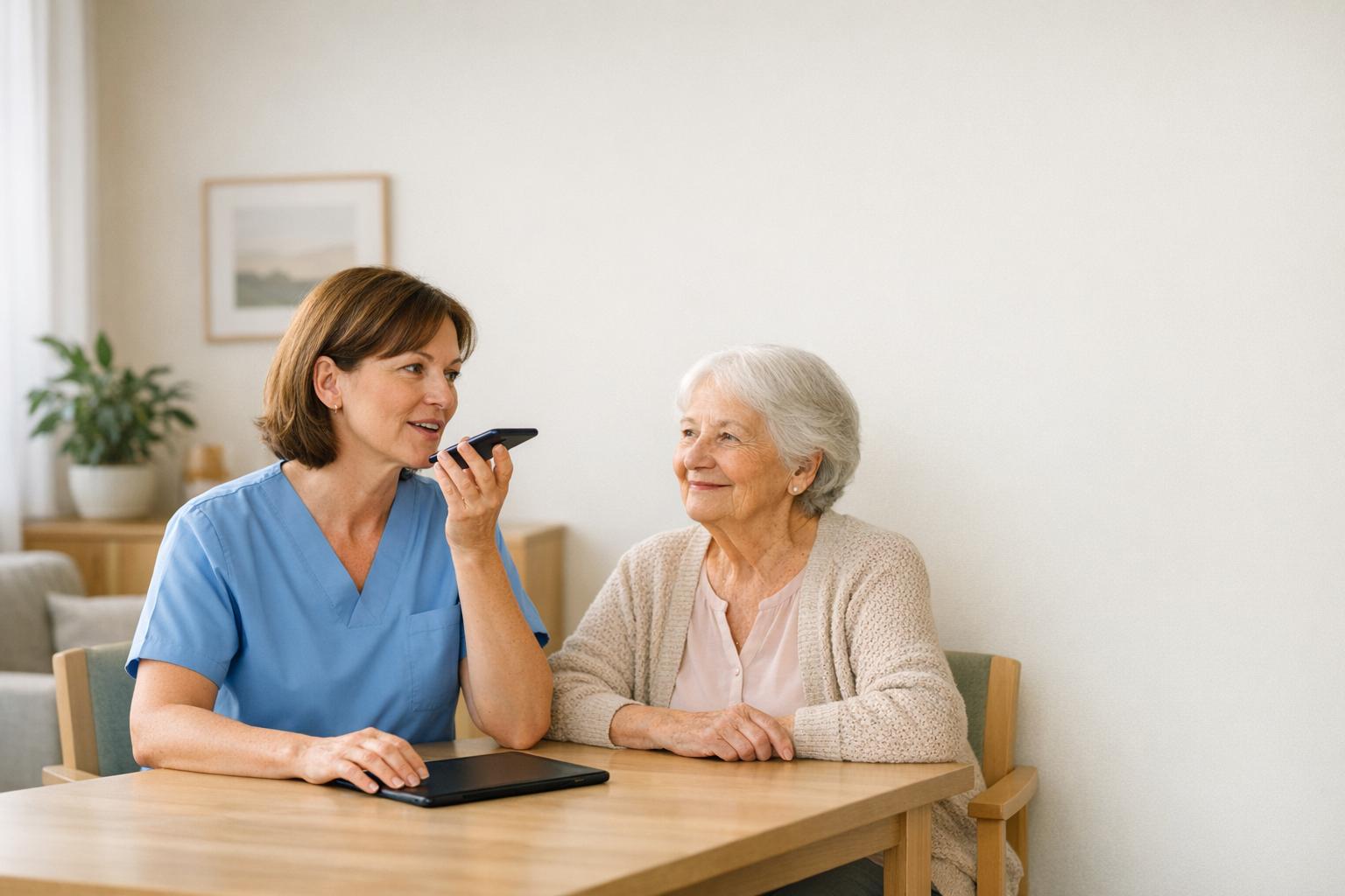 Die Sprachdokumentation ist ein echter Gewinn für Pflegekräfte: Sie ermöglicht es, Beobachtungen und Maßnahmen direkt nach dem Bewohnerkontakt per Sprache zu erfassen. Statt zeitaufwendig am Computer zu tippen, können Pflegekräfte einfach ein Smartphone oder Tablet nutzen – die KI übernimmt die Umwandlung des Gesprochenen in strukturierten Text. Diese Technologie analysiert und strukturiert die Eingaben sofort. So bleiben wichtige Details erhalten, solange sie noch präsent sind.