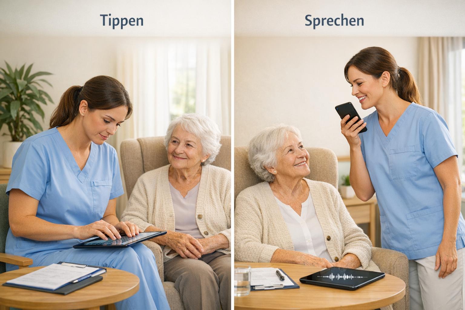 Spracheingabe spart bis zu 33 % Dokumentationszeit, reduziert Fehler und erleichtert den Pflegealltag im Vergleich zum Tippen.