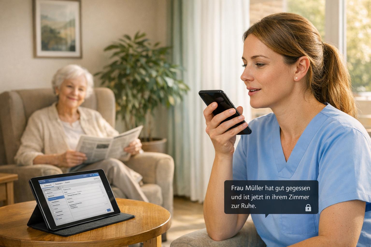 Echtzeit-Spracheingabe erlaubt Pflegekräften, Beobachtungen sofort zu dokumentieren, reduziert Fehler, spart Zeit und entspricht DSGVO-Anforderungen.