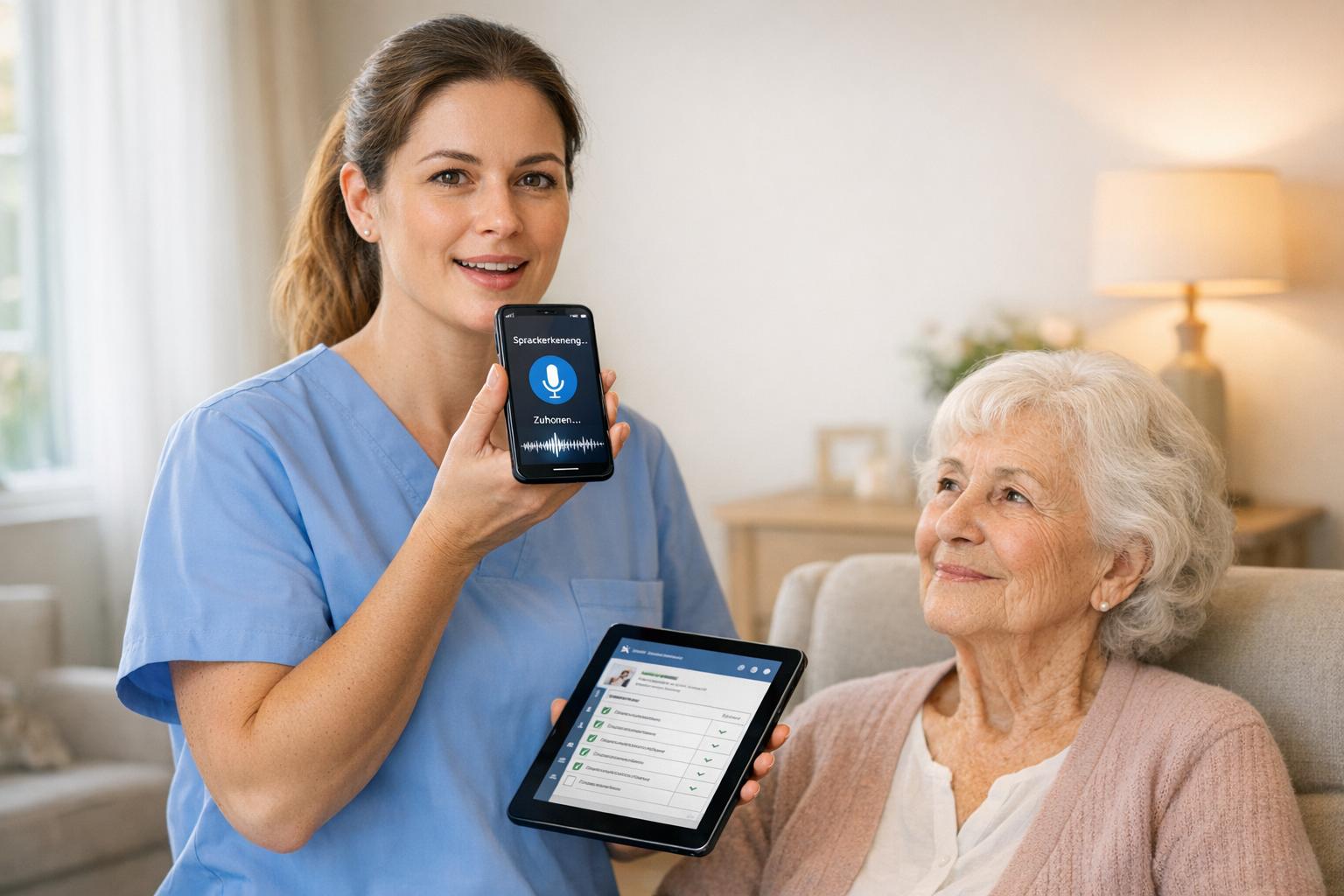 Ein Beispiel liefert die Sozialeinrichtung Diakoneo. Im März 2025 führte sie einen digitalen Sprachassistenten in ihren Senioreneinrichtungen ein, der in das bestehende Pflegedokumentationssystem integriert wurde. Mitarbeitende konnten Vitalwerte, Medikamentengaben und SIS-basierte Aufnahmegespräche direkt per Smartphone erfassen. Das Ergebnis: Eine Zeitersparnis von 20 bis 30 Minuten pro Schicht [4].